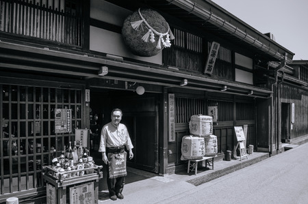 MAY 27, 2013 Takayama ,Gifu, Japan - Old vinatge local Sake liquor shop nice wooden exterior at Sanmachi Suji old Edo district, famous shopping and tourist attraction of Takayama old town.