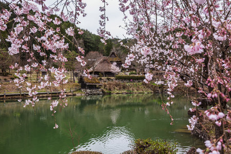 Serene Japanese village scene with traditional thatched-roof houses nestled beside a tranquil pond, framed by vibrant cherry blossoms in full bloom. Shirakawa-gos idyllic beauty captured in spring.
