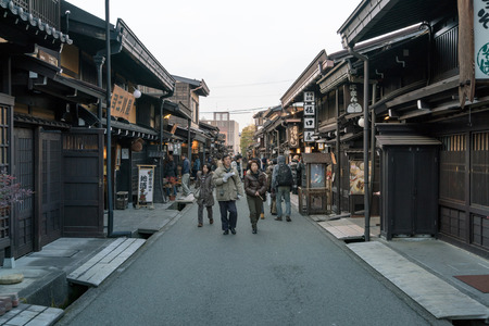 Takayama, Japan - February 21, 2016: Unidentified people at Sannomachi Street, the old town area which has museums and old private houses, some survive from Edo period.