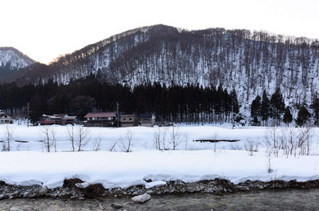 View of Takayama village and miyagawa river with winter snow in Gifu, Japan