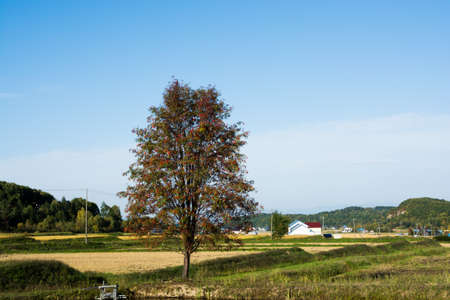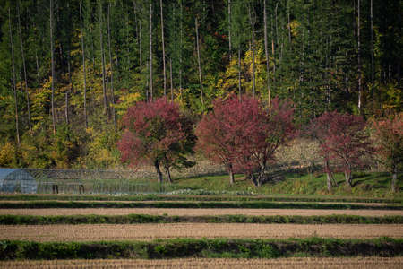 Japanese countryside rural landscape with red cluster amaryllis blooms Oniki terraced rice field, Hasami-machi, Higashisonogi-gun, Nagasaki