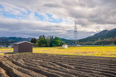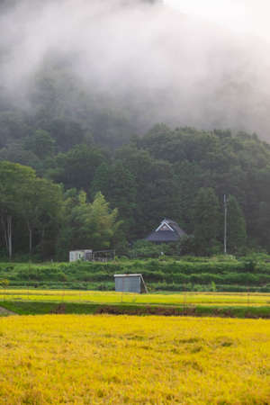 Local Japanese farm village in morning near Magome juku preserved town, Kiso valley, Nakatsugawa, Gifu, Japan. Houses and farmland against sunrise light.