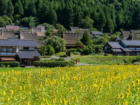 Sunflowers in full bloom at Miyama Kayabuki Village in summer