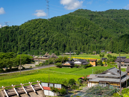 Shirakawago, Japan - September 23, 2016: Aerial view on the center of Shirakawago shows many of the brown farms with the special Joined-hands roofs. Colored by yellow rice paddies and green forests.
