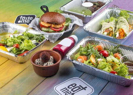 take away lunch boxes with fresh meal in foil container or healthy food delivery