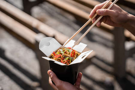 Wok noodles in takeaway box. Woman eating with chopsticks, close up view on female hands. Chinese traditional food with vegetables and seafood.