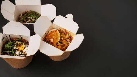 Noodles with pork and vegetables in take-out box on black table. Asian food delivery. Food in paper containers on black background