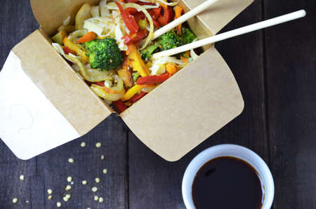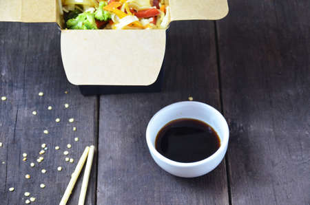 Chinese or korean food noodles on sticks. in the card box take out or to go. soy sauce. with vegetables on a wooden table