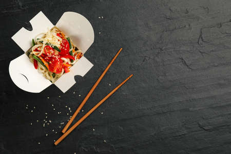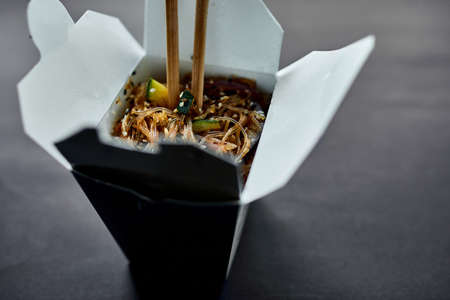 Tasty Udon noodles pasta with tempuru, shrimps wok in box delivery and wooden sticks, Japanese spicy food, Box with Thai food, concept of fast food delivery.
