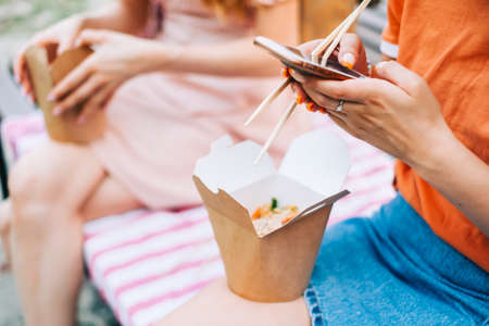 Friends eating street food outdoor on the park and using smartphone, enjoying summer weather.