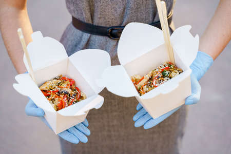 Closeup tasty food wok in box delivery. Girl holds udon noodles with tempuru, shrimps, soy sauce in hands in medical gloves. Chinese spicy food in disposable eco boxes. 2 Wok box udon advertise 1 + 1.