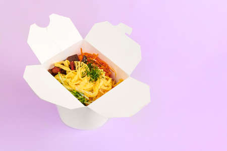 Rice wok with seafood and vegetables in white box isolated on purple background. One open takeout box with rice wok, seafood cocktail and vegetables. Takeaway food, fast food delivery concept