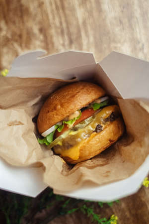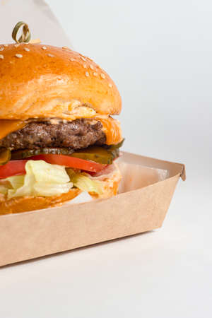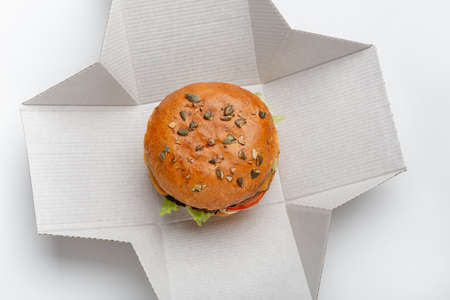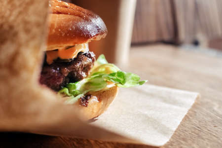 Burger in paper packaging close-up. Food in a fast food restaurant. Macro photo of burger ingredients with meat and vegetables