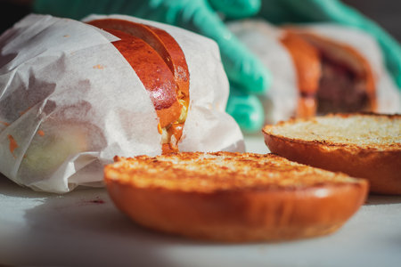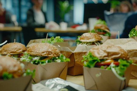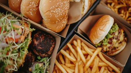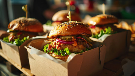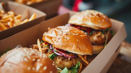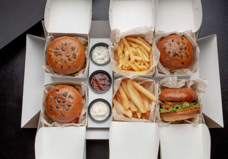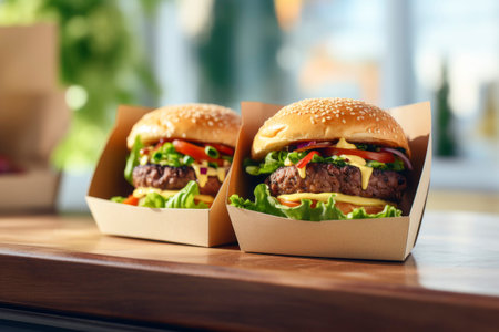 Freshly prepared burgers packed in boxes, perfectly sealed for delivery and utmost taste preservation.