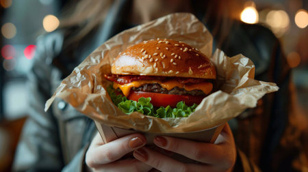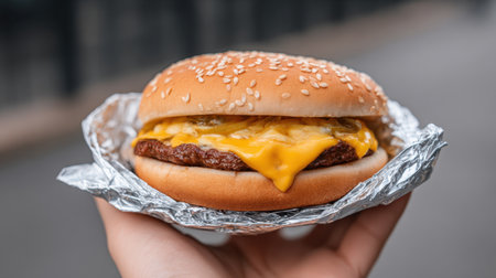 A close-up view of a hand holding a tempting cheeseburger wrapped in foil, showcasing melted cheese, sesame seed bun, and juicy beef patty. Perfect for food lovers.