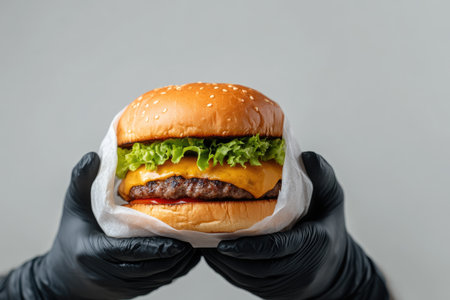 Gourmet Burger Bite with Hands in Black Gloves