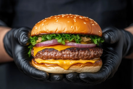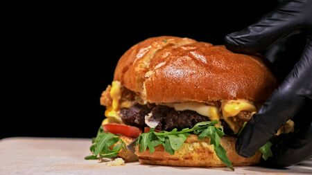 Cut craft burger is cooking on black background in black food gloves. Consist: sauce, arugula, tomato, red onion rings fries, cucumber, cheese, air bun and marble meat beef. Not made ideal. Looks real, loving hand made.