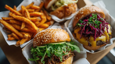Top view of gourmet food from a food truck festival, including sliders and fries, with room for text or branding