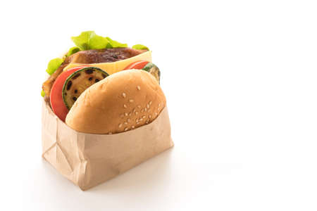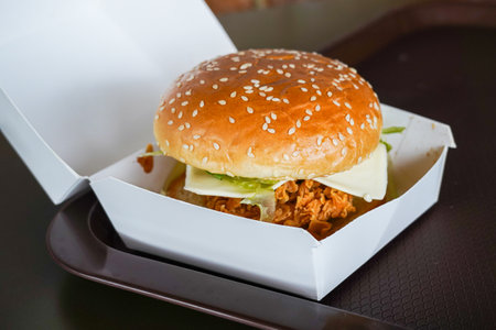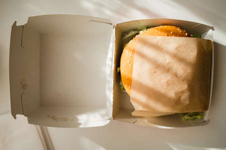 Hamburger is a fast food make from bun meat cheese and vegetable in white paper box