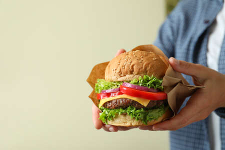 Homemade burger in hands on light background.
