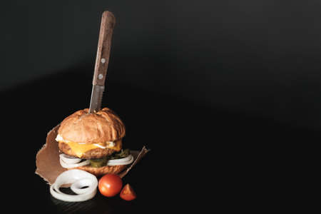 Handmade burger with beef, pickles, cheese, onion and knife on wooden table.