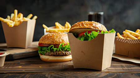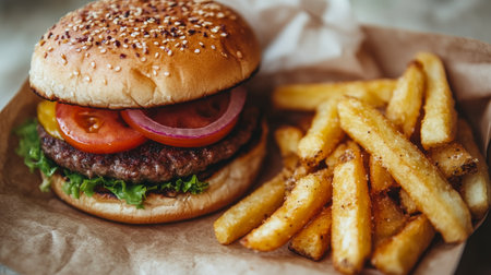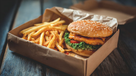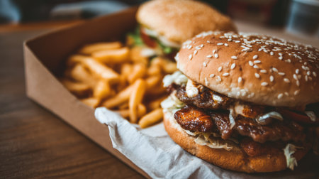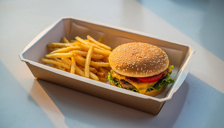 Appetizing fast food combo featuring burger and fries in paper containers, ideal for satisfying cravings
