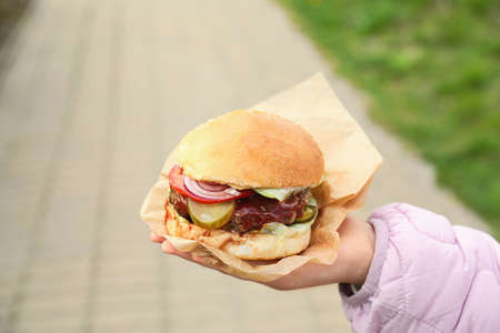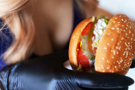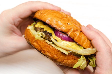 Cut out of a delicious burger held in female hands