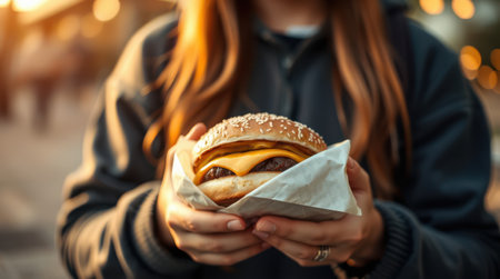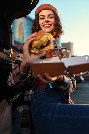 Young woman with burger and bright smile by car in urban outdoor scene, a candid lifestyle portrait capturing authenticity, golden hour glow, mindful living and emotional storytelling in a relaxed