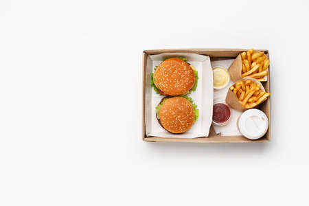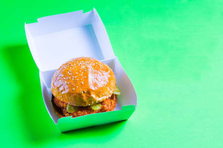 ready burger in carton box on green background.