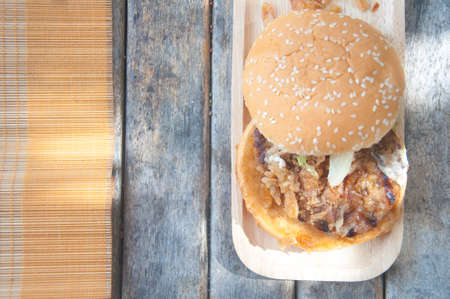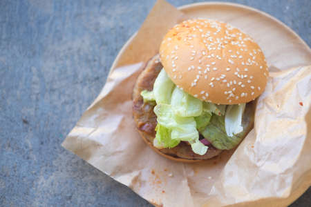 a hamburger Baked bread with vegetables, cream and pork, fast food, popular fast food.