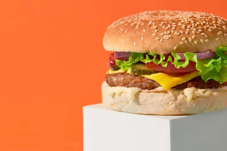 Close up fresh tasty burger on orange background. Cheeseburger with beef, tomato, pickles, lettuce and onion