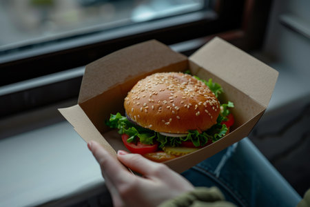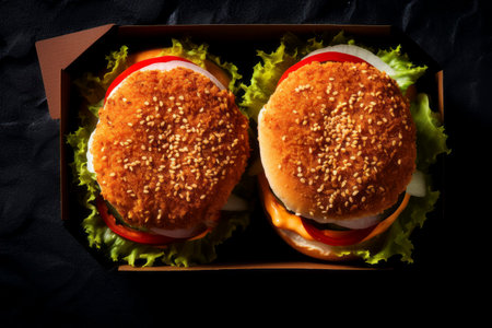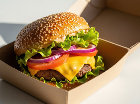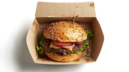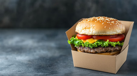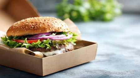 A mouthwatering gourmet hamburger displayed in a takeaway box, featuring fresh ingredients like lettuce, tomato, onion, and a sesame seed bun, perfect for any meal.