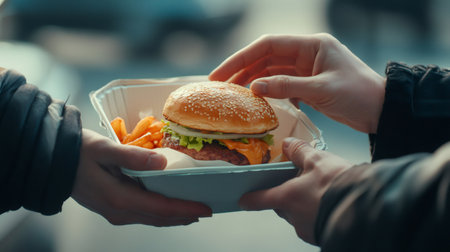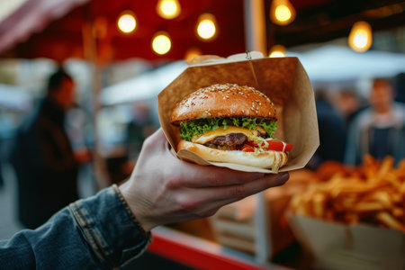 During a vibrant summer market, a street food vendor carefully passes a freshly made burger and fries to a hungry customer, capturing the essence of outdoor eating and festival vibes