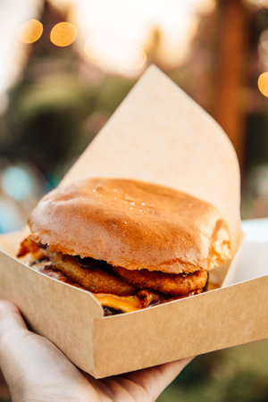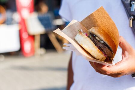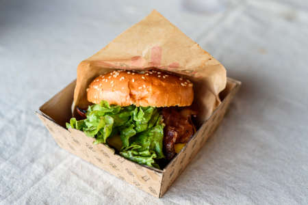 Burger in paper and paper cardboard. Fast food at the festival