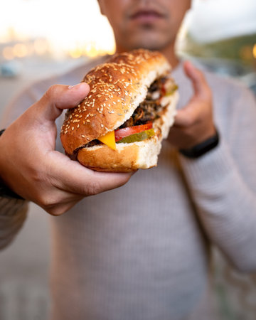 man hands close up holding burger with coffee cup. outdoors