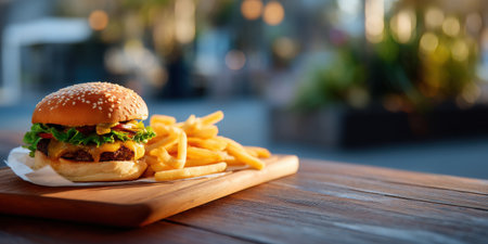 Cheeseburger with lettuce and fries served on wooden board in outdoor setting with warm lighting