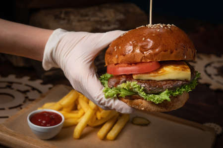 Hand in a disposable glow holding fresh craft beef burger with fried cheese, served with fresh lettuce, French fries and tomato sauce. Restaurant concept. Street food concept.