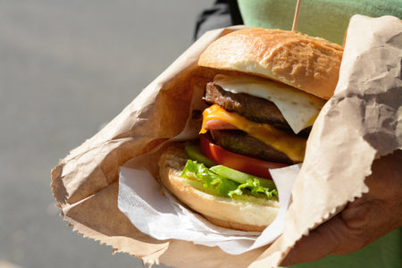 A fast food street food vendor with a freshly made cheeseburger