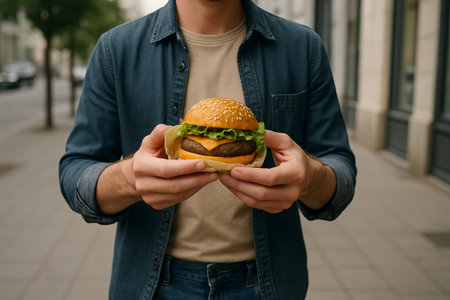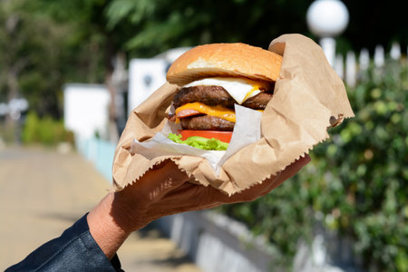 A person eagerly awaits their meal, holding a delicious burger wrapped in parchment and about to enjoy the convenience of mobile ordering