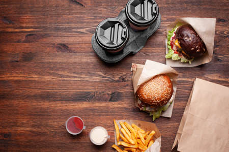 Closeup shot image of two burgers wrapped in tinfoil, french fries potato chips, red cup of coffee or tea on tray on wooden table in fast food restaurant
