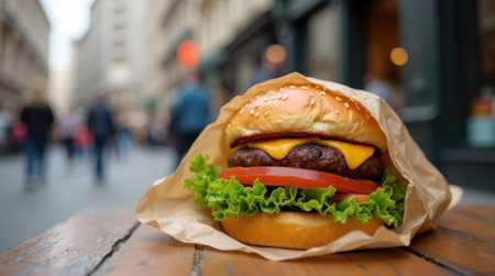 A delicious cheeseburger with a thick beef patty, melted cheese, fresh lettuce, and tomato rests on a wooden table in a busy urban street.
