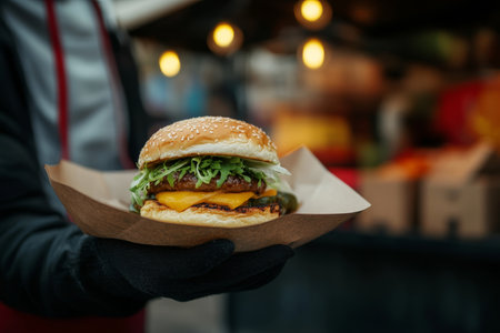 Vibrant street food scene featuring a vendor crafting a delicious freshly made cheeseburger