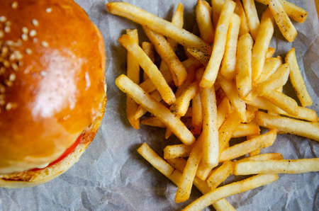Fried fries and blurred hamburger background. Unhealthy food concept. Delicious fast food. Juicy burger with baked bun, melted cheese, meat patties and vegetables.