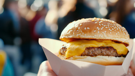 Juicy cheeseburger with melted cheddar cheese, served in a takeaway container, is being enjoyed at a bustling summer street food market, creating a vibrant festival atmosphere
