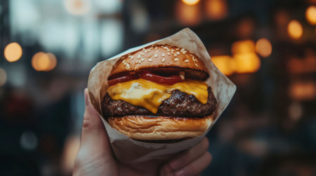 A close-up shot of a delicious cheeseburger topped with ketchup and mustard, held in a hand against a warm, inviting restaurant backdrop. Perfect for food enthusiasts.