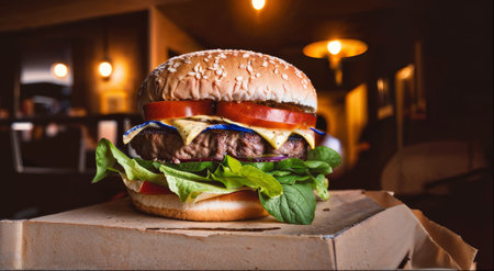 Burger with cheese, tomato and lettuce on top of a box in a bar lit from behind