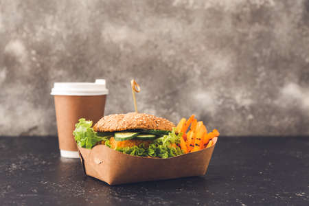 Tasty vegan burger with cup of coffee on table