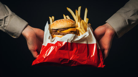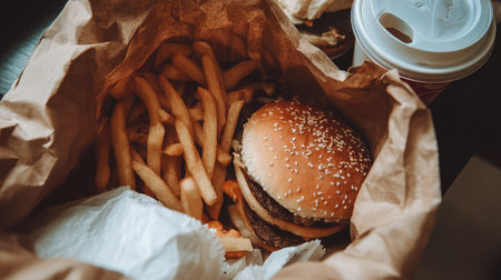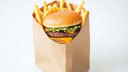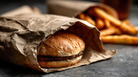 A close-up image features a delicious hamburger nestled in a brown paper bag alongside crispy fries, creating a perfect casual snack scene.