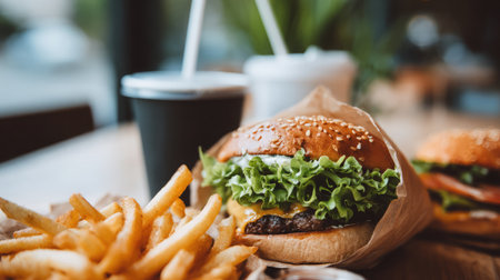 A tempting burger topped with fresh lettuce and melted cheese, served alongside golden fries, perfect for a casual dining experience in a stylish caf
