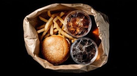 A tempting fast food meal featuring a burger, crispy fries, and two cups of soft drinks, all served in a brown paper takeout bag on a black background.